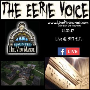 11/30/17 9pm est THE EERIE VOICE welcomes Hillview Manor and it’s Manager/Tour Guide Rachelle Rozzo and Tour Guide Jim Backus. Join us as we dive into the amazing location! The Lawrence County Home for the Aged, also known as the poor house or poor farm housed the county’s mentally ill, severely destitute, and elderly residents …